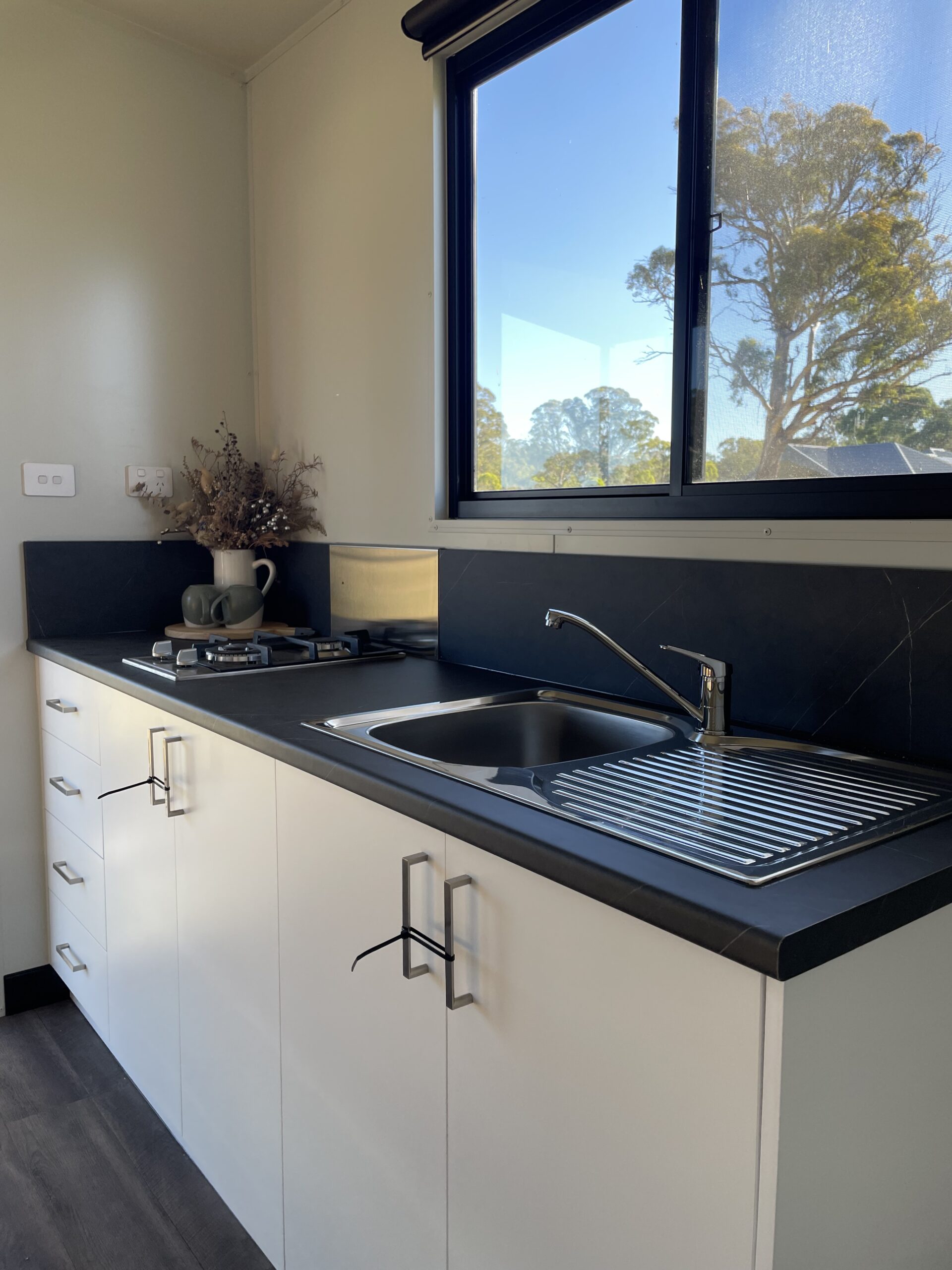 - Straight Kitchen with melamine benchtop, sink, drainage, two burner LPG gas cooktop and bar fridge or washing machine space